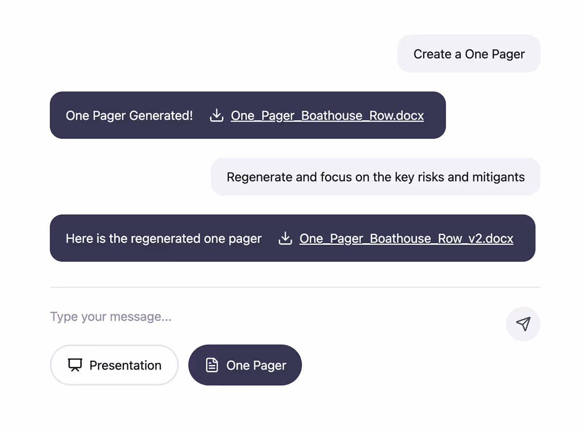 Generate one-pagers, underwritings or IC presentations with your templates, and live source citations